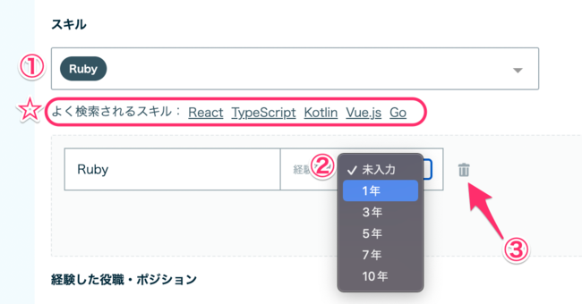 ・さらには、検索条件で職種を選択している場合に、該当の職種に応じたスキルが表示されるように(☆の箇所)