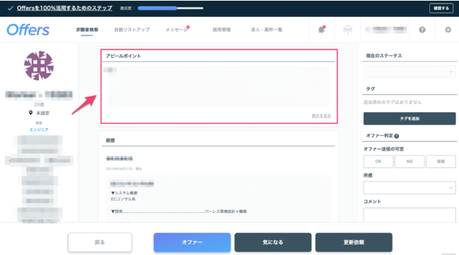 「候補者検索」機能は、条件に合ったOffersユーザーを検索できる機能です。企業の採用担当者や現場のITエンジニア/デザイナーが、自社の条件に合う候補者を探す際に利用します。