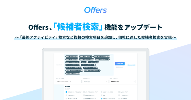 ITエンジニア/デザイナーの副業・転職サービス「Offers(オファーズ)」を運営する株式会overflow(本社:東京都港区、代表取締役: 鈴木裕斗・田中慎 以下、overflow)は、「候補者検索」機能のアップデートを行いました。本アップデートにより最終アクティビティ検索など、計5つの項目を追加・変更し、より個社の状況に適した候補者を探しやすくなりました。