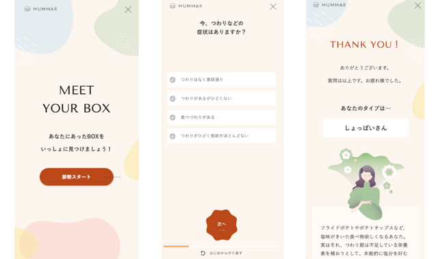 診断では、出産予定日や体調、食欲や味覚などを回答することで今のあなたに寄り沿ったボックスを実現。つわりがひどくあまり食欲がない人には柑橘系のゼリーやスープ、甘いものが食べたくなる人には低カロリーで、糖質を抑えたクッキーなど。妊娠期間特有の嗅覚や味覚はもちろん、葉酸やカルシウムなど妊娠時期によって異なる摂取推奨栄養素やカロリーも考慮した内容になっています