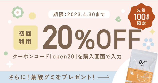 先着100名様限定で初回ボックスが20%OFFで購入できるキャンペーンを実施中です。さらに、1袋1200円相当の葉酸グミをプレゼント。お得な機会にぜひご購入ください。