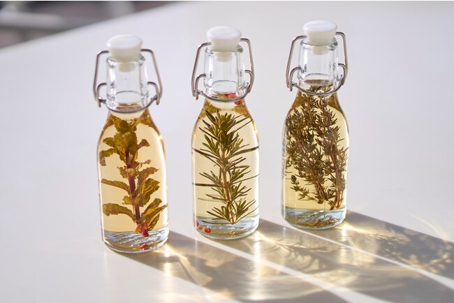 「グランヴォー スパ ヴィレッジ」で育てた自家栽培ハーブを使って、ドレッシングや揚げ物などの味の仕上げに使えるハーブビネガーづくり体験を提供します。作成後、日の当たらない場所に2週間ほど置けばできあがりです。旅のお土産として、自宅で「ハーブのある暮らし」をお楽しみいただけます。