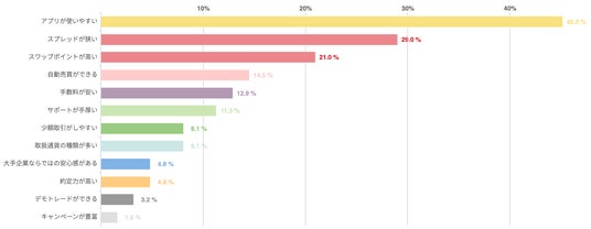 アンケートによれば、「アプリの使いやすさ(45.2%)」が最も多く、次いで「スプレッドの狭さ(29.0%)」「スワップポイントの高さ(21.0%)」が続く結果となった。