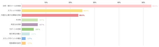 また、「スプレッドの安定(25.0%)」や「FX取引関連情報の充実(23.3%)」も多くのユーザーから挙げられた。特に「朝方のスプレッドが広がりやすいので安定させてほしい」「マーケット情報面が不足しがちなので充実させてほしい」などの要望が複数の投資家から寄せられている。