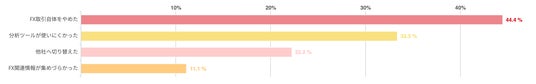 アンケートによれば、みんなのFXでの取引をやめた理由としては、「FX取引自体をやめた」が44.4%で一番多かった。具体的には「取引時に大きな損失を出したので、インデックス投資に切り替えた」「相場変動が激しく、安定して利益が得られないと思ってやめた」といった意見が並んだ。