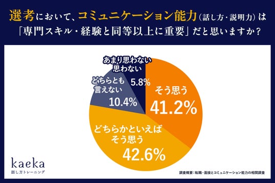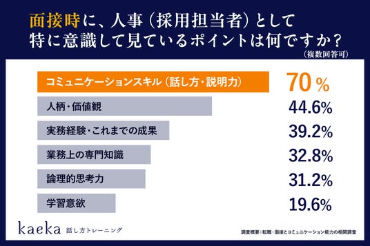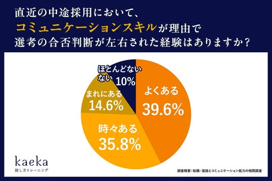 話し方トレーニングサービス「kaeka」を提供する株式会社カエカ(本社:東京都中央区、代表取締役社長:千葉佳織)は、人事担当者 500名対象に実施した「転職・面接とコミュニケーション能力※1の相関調査」の結果を発表しました。本調査では、90.0%※2が「コミュニケーションスキルが理由で中途採用の合否判断が左右された」と回答し、転職や中途採用選考においてコミュニケーション能力が、重要なスキルとして明らかになりました。