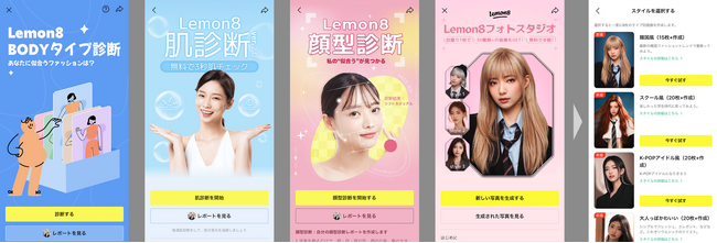 さらに投稿以外に、Lemon8ユーザーは無料で顔型診断、肌診断、BODYタイプ診断などの機能を利用できます。診断を通じて自分の顔型や体型を知り、最新の美容情報やコツを簡単にキャッチできます。新たにリリースした「Lemon8フォトスタジオ」機能では、自撮り画像1枚でさまざまな機械学習によりフォトを生成し、保存して友達と共有、または投稿するなど、常に新しい自分と出会えます。