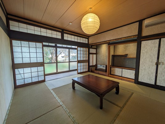 1Fの和室の部屋。部屋から見える山や畑などの懐かしい景色を見ながら、まったりと過ごせます。