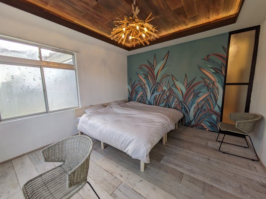 「YUTTARI(ゆったり)」(一棟貸し)施設紹介1組限定の部屋です。天井の高い開放感のある寝室、食事のできるダイニングルームがついており、お風呂やトイレを他の方と共有することなく完全貸切のプライベート空間でゆったりと島暮らしを満喫できます。大人数でのご利用の方におすすめです。