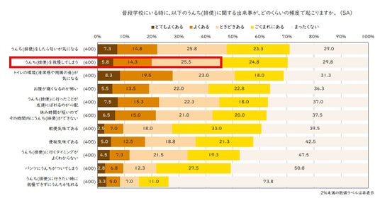 親と子どもそれぞれに、うんちについての教育を受けたことがあるか尋ねたところ、親子ともに約7割が「教育を受けたことがない」と回答。うんちに関する教育機会は親世代も小学生も十分ではないことがわかりました。また、学校滞在時にどのくらいの頻度でうんち(排便)に関する出来事が起こるか聞いたところ、「トイレの環境(清潔感や周囲の音)が気になる(50.8%)」「うんち(排便)をしたら臭いが気になる(47.8%)」というトイレ環境に関する出来事に次いで、45.5%の子どもが「うんち(排便)を我慢してしまう」と回答。日常の多くの時間を過ごす学校で、これだけの子どもがうんちを我慢してしまっている現状が明らかになりました。