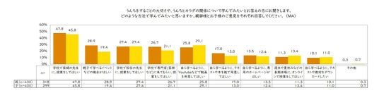 親子にわたってうんちに関する教育が不十分という状況の中、うんちをすることの大切さや、うんちと身体の関係について学べる機会があれば学んでみたいと答えた答えた親子のうち、どのような方法で学んでみたいかという質問に対し、親も子も「学校で保健の先生に、授業をしてほしい」と答えた割合が最も多く、約半数にのぼりました。グラフ1で「うんち(排便)に行ったことが友達にばれるのが心配」と答えた子どもが45.0%であることからも、学校で一斉にうんちに関する教育を受けることで、うんちをすることの大切さを子どもたちの間で共通認識として持ち、うんち(排便)は恥ずかしいことではないという意識に変えていくことが効果的であるといえます。