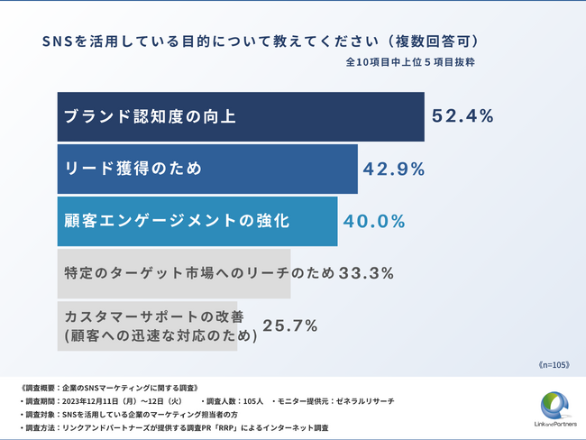 これらの疑問を解消するため、株式会社リンクアンドパートナーズは、SNSを活用している企業のマーケティング担当者の方を対象に、「企業のSNSマーケティングに関する調査」に関する調査を実施しました。