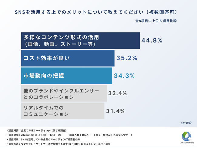 SNSを活用するメリットは、「多様なコンテンツ形式の活用(画像、動画、ストーリー等)」が最多を占める結果に。