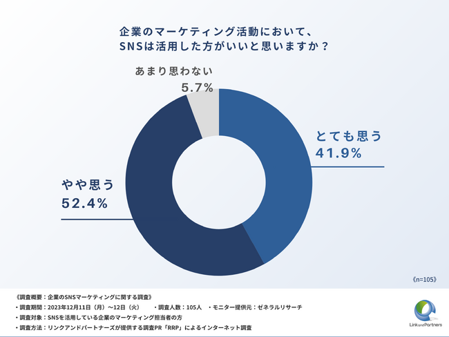 また、9割以上の担当者が企業のマーケティング活動においてSNSの活用を肯定しており(「とても思う」41.9%、「やや思う」52.4%)、これらの結果からは、現代のマーケティング戦略におけるSNSの重要性と、その効果的な利用が企業成長に不可欠であることが示されました。