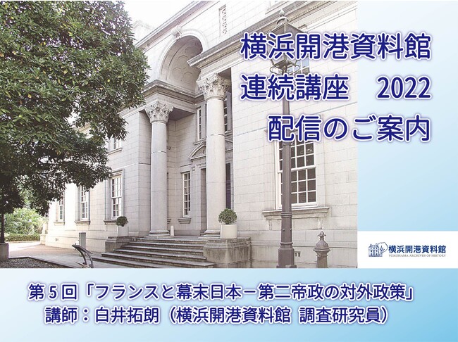 当館調査研究員が月に一回、横浜の近現代史に関するさまざまなテーマをお話し、9月24日にスタートした「横浜開港資料館 連続講座2022」の有料オンライン配信がスタートします。お好きなタイミングでご覧いただけます。(いずれの講座も90分前後、会場での講座と同じ配付資料付き)
