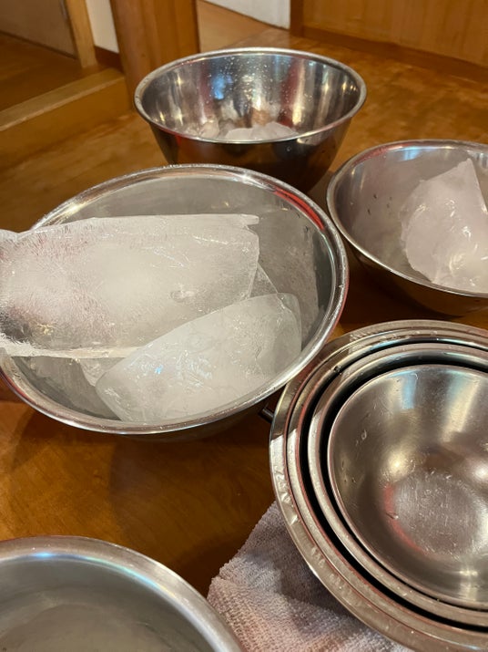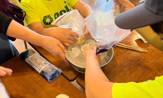 液体(ジュース)はどうやって氷のように固まるのか?冷凍庫がない時に今ある材料でどうしたら冷え固まるのか、チームで話し合いながら試してみる活動を行いました。氷が入ったボールの周りが少し凍ってきてる様子を発見したり、温度計で氷が入ったボールの温度が下がる現象を目をキラキラさせながら教えてる様子がありました。試行錯誤しながら新しい発見を仲間と共有する時間は貴重な体験でした!最後はみんなで出来たてのシャーベットをパクリ。わくわくドキドキ美味しい時間になりました。