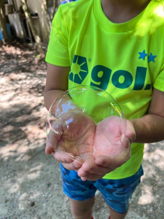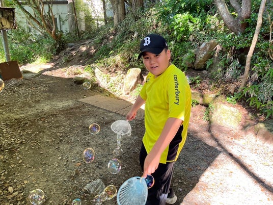 保護者様A: 「アクティビティももちろん、シャボン玉がとても、楽しかったようです。針金やうちわ、ストローを使って比較できたようで実験のような感じでよかったようです。ちょうど科学の実験の図鑑を購入して、(子どもが)やりたいと言ってたので嬉しいです。調合も自分たちで協力してやったことを教えてくれて家でもやってみたいと言ってくれました。ワクワクするような体験をありがとうございました。」
