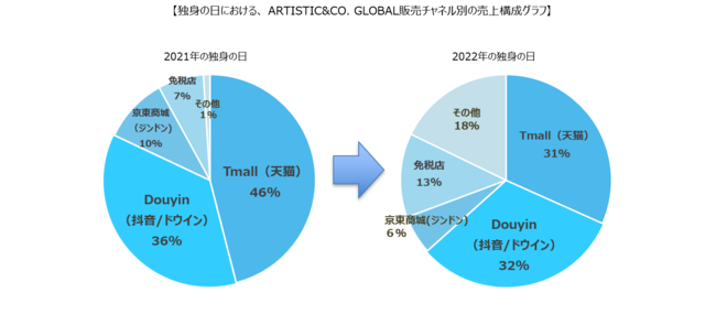 2021年の独身の日においても当社は「Douyin(抖音/ドウイン)」を積極的に活用することで、販売構成比こそ減少していますが、売上については前年比110%超の成果を上げることができました。