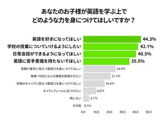 「あなたのお子様が英語を学ぶ上で、どのような力を身につけてほしいですか?(複数回答)」という質問をしたところ、「英語を好きになってほしい」が最も多く(44.3%)、ついで「学校の授業についていけるようにしたい(42.1%)」となりました。