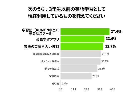 現在すでに英語学習に取り組んでいる子どもを持つ親に対して、学習方法を聞いたところ、最も人気なのが「学習塾(KUMONなど)・英会話スクール」で37.6%、ついで「英語学習アプリ」が33.6%、「市販の英語ドリル・教材」が32.7%となりました。