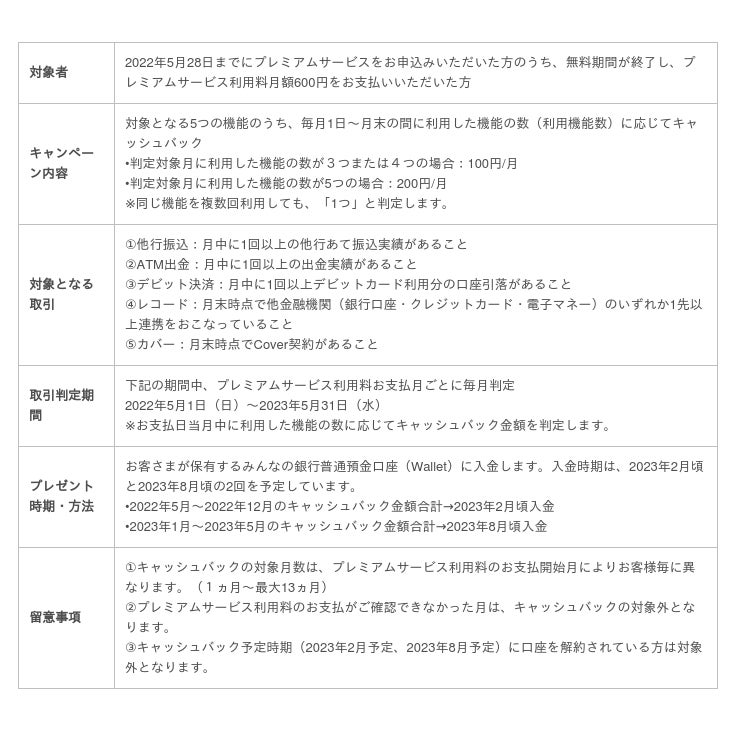 また、 2022年5月28日までにプレミアムサービスにお申込みいただいた方のうち、1年の無料期間が終了した方を対象に『プレミアム会員限定キャッシュバックボーナス』を実施します。 無料期間終了後も、継続してプレミアムサービスを利用いただき、プレミアムサービス利用料月額600円をお支払いいただいた方には、2022年5月28日から2023年5月31日の期間中、毎月の取引利用状況に応じて、現金をキャッシュバックいたします。