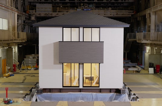 を組み合わせた木造住宅の耐震性能を、実際の住宅規模の建物を用いた実大振動試験として実施し、大地震時の建物の挙動や損傷の有無を詳細に分析しました。
