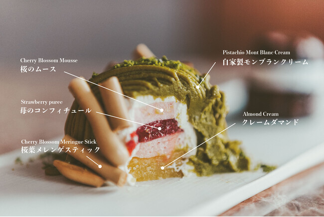 スペイン産ピスタチオペーストと自家製クレーム・パティシエールを合わせたモンブランクリームは、卵とバニラの風味の中にピスタチオの豊かな香りが感じられます。桜のムースと苺を煮詰めたクーリを重ね層にした土台と、桜の葉パウダーを練り込んだメレンゲスティックを添え、春らしい香りと春の芽吹きをイメージした一皿に仕上げました。