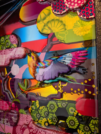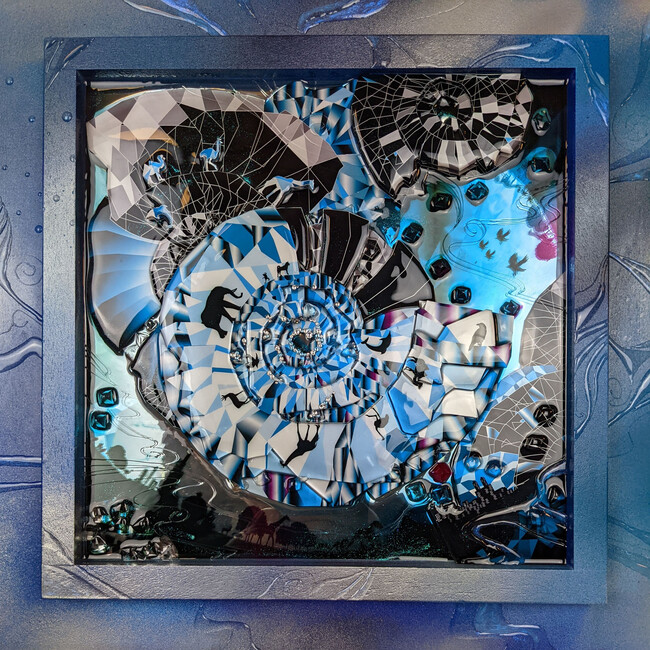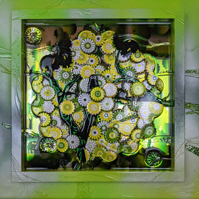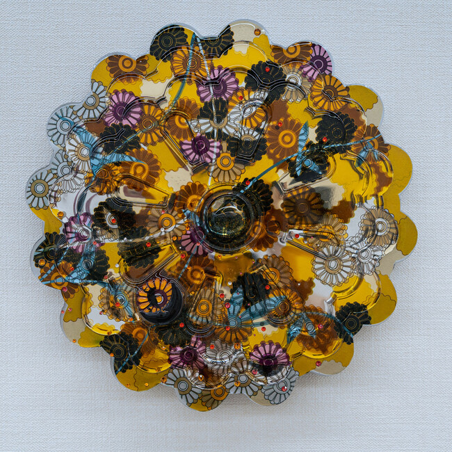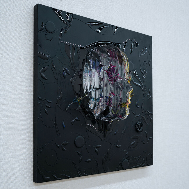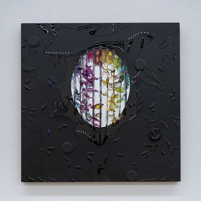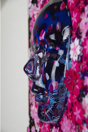 その作品群の多くは、オリジナルのデジタルイラストをベースに、金属などの異素材を組み合わせ、アクリル透明樹脂でコーティング、さらにその上にラインストーンなどで装飾した、半立体ミクストメディア作品です。個々の魅力を発揮する多様な素材を、ジャンルを越えて融合することで、唯一無二の色彩あふれる世界を作り上げているのです。