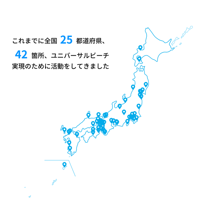 須磨海岸でのプロジェクト実施だけでなく、全国に広めようとこれまでに9のきょうだいプロジェクトが発足し、25箇所で出張ユニバーサルビーチを行ってきました。