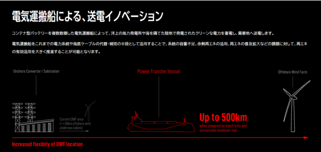 日本の再生可能エネルギー資源として洋上風力発電に注目が集まる中、パワーエックスが開発・製造する電気運搬船は、洋上風力発電の普及・拡大に向けて早期の実用化が期待されております。2025年には、1回の航行で20万9千世帯分の電力(※)を運搬可能な電気運搬船「Power ARK」の1号艇(プロトタイプ)が完成予定であり、沖合に建設した風力発電の送電を船による電気輸送で行うため、海底ケーブルを敷設する場合に比して、コスト面や発電稼働までのリードタイム短縮のメリットが見込まれております。
