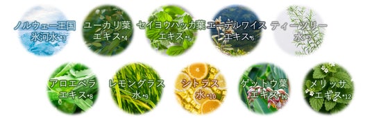 ※1 塗布した直後 ※2 30℃・風ありの状況下で塗布した直後の感触(当社調べ) ※3 美容液成分のこと ※5 角質層まで *1 メントール(清涼成分) *2 水(ノルウェー産氷河水)、ユーカリ葉エキス、セイヨウハッカ葉エキス、エーデルワイス花/葉エキス、ティーツリー葉エキス、アロエベラ葉エキス、レモングラス葉/茎エキス、ユズ果実エキス、ゲットウ葉エキス、メリッサ葉エキス(全て保湿) *3 水(ノルウェー産氷河水)(保湿) *4 ユーカリ葉エキス(保湿) *5 セイヨウハッカ葉エキス(保湿) *6 エーデルワイス花/葉エキス(保湿) *7 ティーツリー葉エキス(保湿) *8 アロエベラ葉エキス(保湿) *9 レモングラス葉/茎エキス(保湿) *10 ユズ果実エキス(保湿) *11 ゲットウ葉エキス(保湿) *12 メリッサ葉エキス(保湿)