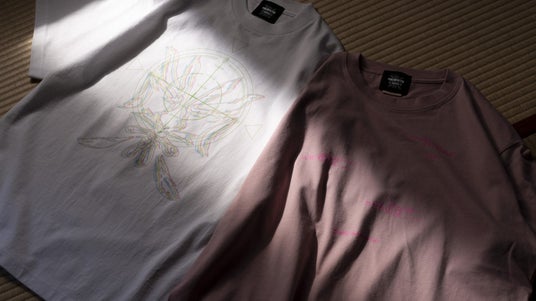 ロンTリメイクの羽織には蛍光糸で刺繍や縫製を施し、歌舞伎の文字をスライスして組み合わせたグリッチデザインのロゴを蛍光インクでプリントする事でサイバー感を演出。