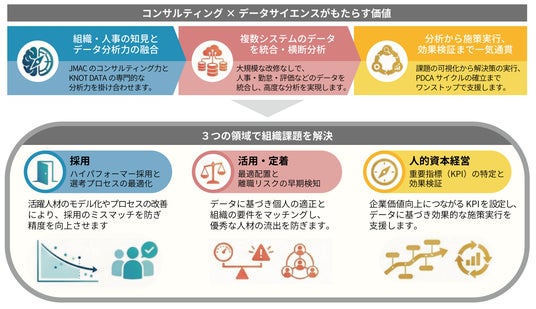 JMACが持つ「組織・人事コンサルティングの知見」と、KNOT DATAが持つ「データサイエンス力」を結びつけることで、施策の実行・運用までを見据えた “実装と成果”に直結するピープルアナリティクスを提供します。
