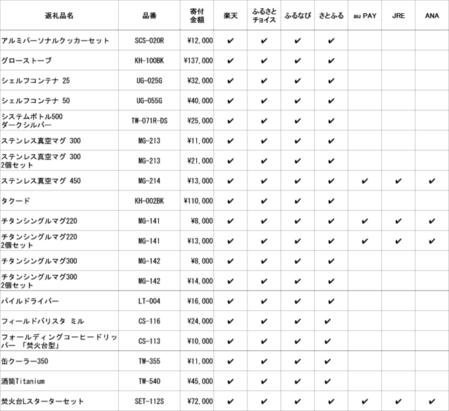 ●「焚火台Lスターターセット」や「シェルフコンテナ 25」など品切れとなった19品目を8月19日(金)20:00に楽天ふるさと納税、ふるさとチョイス、ふるなび、さとふる、JRE MALL ふるさと納税、au PAYふるさと納税、ANAのふるさと納税に出品