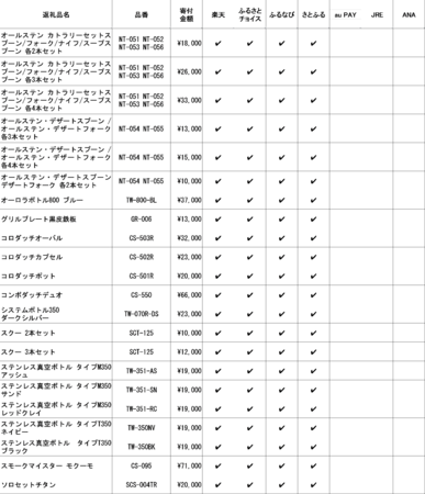 楽天ふるさと納税、ふるさとチョイス、ふるなび、さとふる、JRE MALL ふるさと納税、au PAYふるさと納税、ANAのふるさと納税にて出品の予定です。(別表参照)
