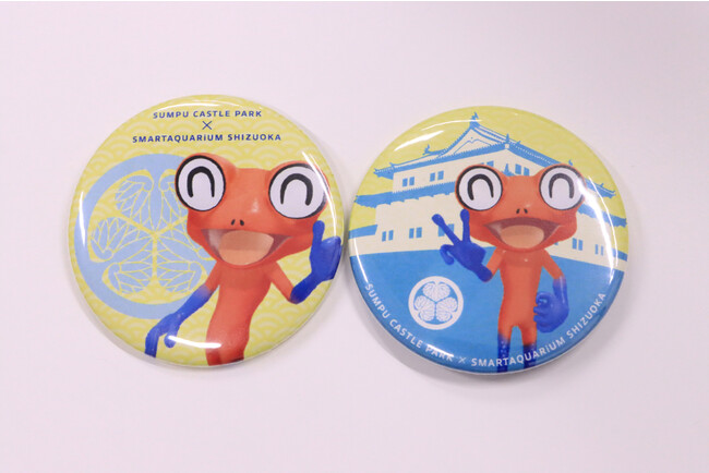 「静岡 御城印・魚朱印巡り」開催期間中、駿府城公園で販売している「御城印」とスマートアクアリウム静岡で販売している「魚朱印」の両方を集めた方に、オリジナルコラボ缶バッチをプレゼント(期間中に入場した施設入場券半券提示が必要)。缶バッチデザインは、徳川家康公の家紋「三つ葉葵」や駿府城とスマートアクアリウム静岡のキャラクター「オスカル」をあしらったポップなデザインに仕上がっています。