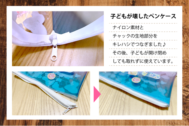 布やナイロン素材などの異素材同士を、ボンドや針で縫うことなく張り合わせることができるため、補修シールとして破損した大切な持ち物を補修することができます。ポリ素材の縫い目が破れると、縫っても裂けやすく縫いにくいですが、キレハシを貼ると補修が簡単に終了します。洗濯もできるので、目立たない場所であればお洋服などにも使えます。