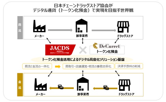 - 検討背景 JACDSは、「健康産業としてのわが国のドラッグストア業態の産業の推進」、「ドラッグストア産業の具体的な発展、育成に必要な情報の収集、提供」「ドラッグストアを取り巻く生活者、産業界、行政に対する建議、提言を行い、国民の健康と豊かな暮らしに寄与する」を目的に活動をしております。 また、2025年度事業計画の重点施策の1つとして、「店舗運営や物流の効率化、返品率削減、防犯などの課題解決を目指す」と掲げております。商取引・店舗運営・物流の効率化において、トークン化預金の活用によるサプライチェーンの商流と金流の一体化による事務効率や、従来の決済インフラと比較した場合の店舗決済手数料の削減への期待から、JACDSは2025年6月よりデジタル通貨フォーラムに参加し、本検討の協議を続けてまいりました。