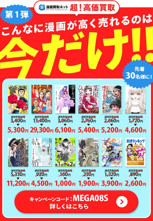 この期間限定キャンペーンでは、先着30名様限定(全タイトル)で、人気漫画12タイトルを特別な高価買取価格で買取いたします。また、夏休みやお盆休みの長期休暇を利用して、お片付けを考えている方に読み終わった漫画をお得に手放す絶好のチャンスです。ぜひこの機会をご利用ください。