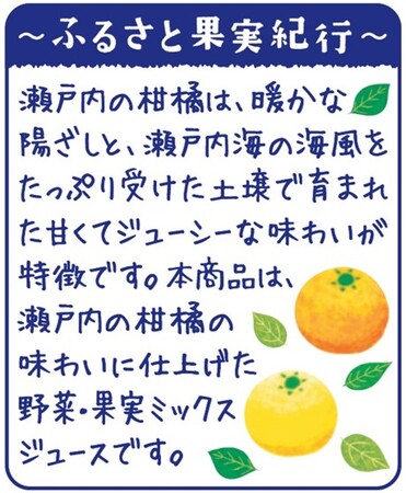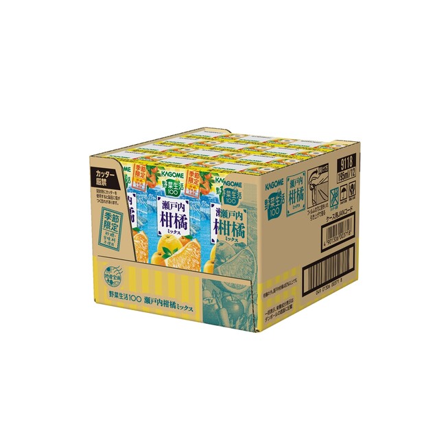 「野菜生活100 瀬戸内柑橘ミックス」は、瀬戸内産柑橘6種(うんしゅうみかん、ぽんかん、はっさく、清見、ネーブルオレンジ、河内晩柑)を使用した野菜・果実100%ミックスジュースです。暖かな陽ざしと、瀬戸内海の海風をたっぷり受けた土壌で育まれた甘くてジューシーな味わいをお楽しみいただけます。パッケージの背景には、背景には瀬戸内海にかかる「来島海峡大橋」をデザインしています。朝食のおともやリフレッシュしたいときにおすすめです。