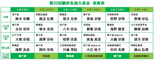 駿府各流大茶会実行委員会(静岡県茶道連盟、静岡新聞社・静岡放送)は、令和7年4月9日(水)~14日(月)の6日間、静岡伊勢丹の8階大催事場で『第30回 駿府各流大茶会』を開催します。和室のような「本席」、屋外の茶室に見立てた「野点(のだて)席」、「立礼(りゅうれい)席」と呼ばれる椅子に座った茶席を2か所用意しています。お茶席は1日4席です。