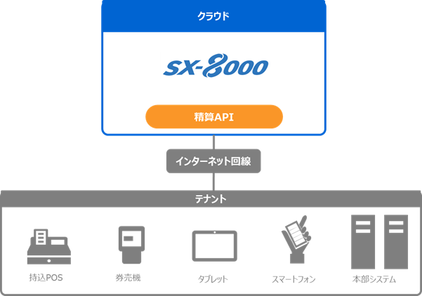 「精算API」は東芝テック製のテナント売上管理サービス「SX-8000」に対応しているため、テナント各社が使用しているPOSシステムなどの端末から「精算API」を経由することで、「SX-8000」へ売上報告や訂正を直接行うことが可能になります。これによりテナント・デベロッパ双方の業務効率化に貢献します。
