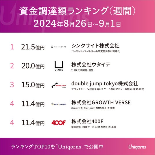 国内最大級のスタートアップメディア「Uniqorns(ユニコーンズ)」が2024年8月26日~9月1日のスタートアップ資金調達状況をランキング形式で発表
