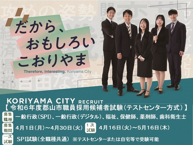 受験申込みから最終試験まで完全オンライン対応のテストセンター方式により、令和7年4月1日採用予定の令和6年度郡山市職員採用候補者試験の受験者を令和6年4月30日(火)まで募集しています。