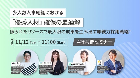 この度、株式会社Waris様、株式会社ラフール様、株式会社Another works様と、「少人数人事組織における優秀人材確保」をテーマに共催ウェビナーを開催いたします。