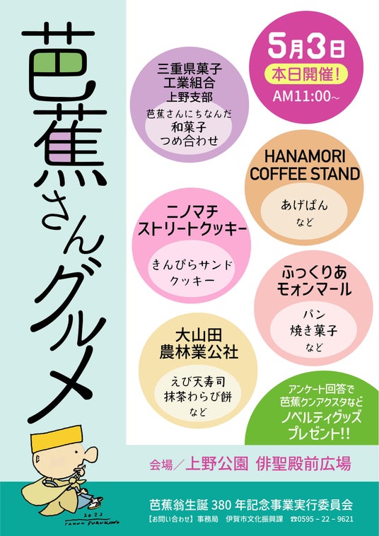 5月3日(金・祝)~5月5日(日・祝)に三重県伊賀市の伊賀上野城下町一帯で開催する、「伊賀上野NINJAフェスタ2024」の開催に合わせて、初日である5月3日(金・祝)限定で、芭蕉さんにちなんだフードやスイーツが上野公園俳聖殿前広場に集結します。