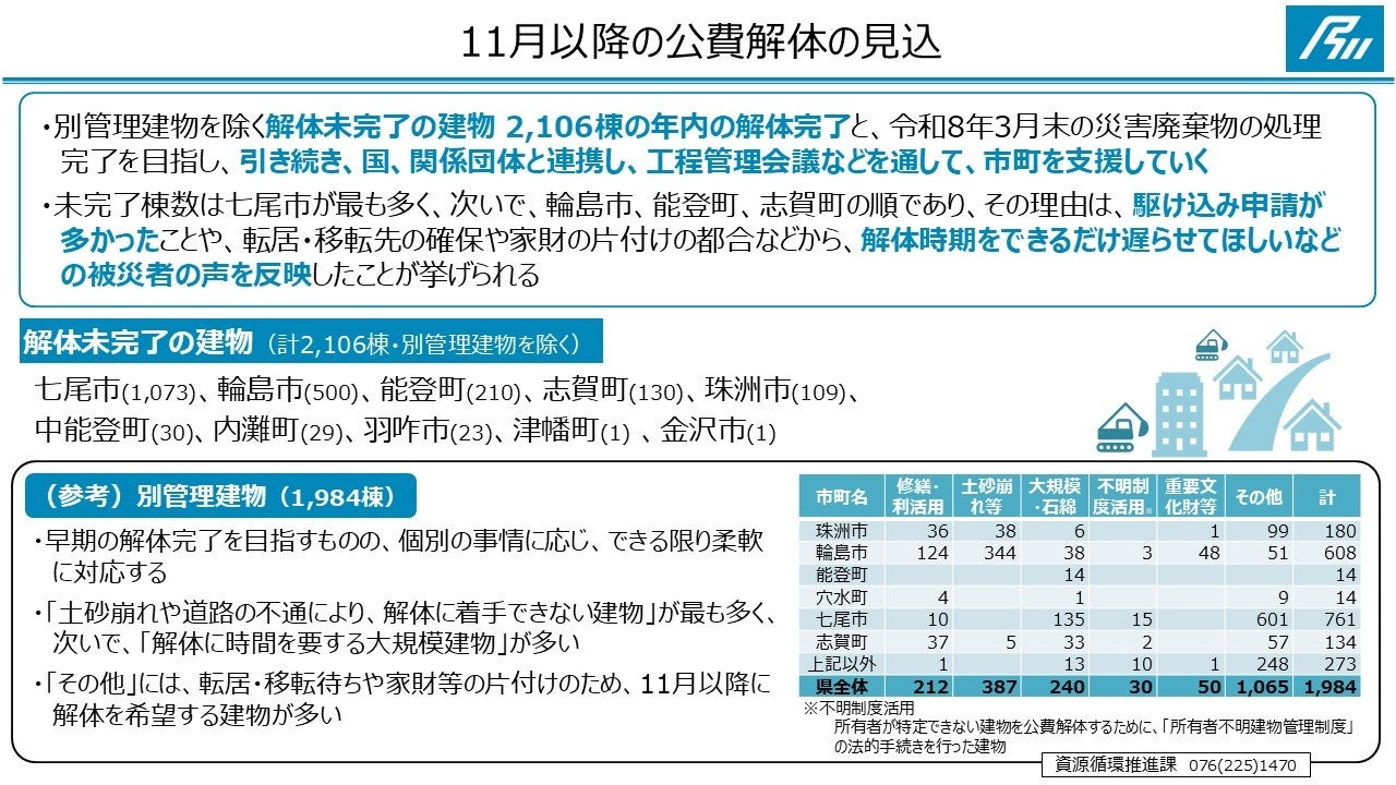 11月以降の公費解体の見込については、別管理建物を除く解体未完了の建物 2,106棟の年内の解体完了と、令和8年3月末の災害廃棄物の処理完了を目指していきます。