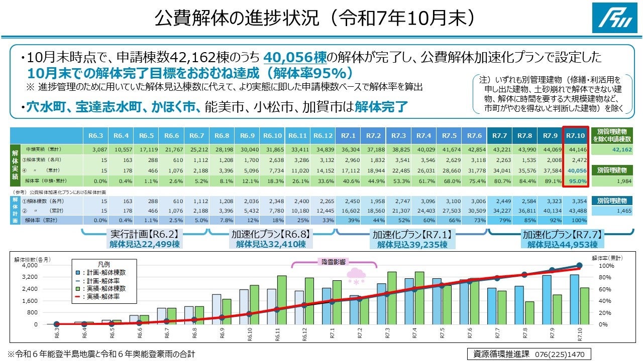 発災直後の令和6年2月に、解体見込み棟数を約22,500棟と推計し、その後、3度にわたり見直しを行い、今年7月には約45,000棟となり、当初の見込みの約2倍となりましたが、10月末の解体完了目標は変えずに取り組んできました。