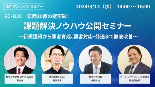 ECサイトの運営代行サービスを提供しているマーケティングアソシエーション株式会社(本社:東京都台東区 代表取締役:中園広和、以下当社)は、2024年3月13日(水)に、ウェブセミナー『EC・D2C 年商10億の壁突破! 課題解決ノウハウ公開セミナー ~新規獲得から顧客育成、顧客対応・発送まで徹底改善~』を、株式会社売れるネット広告社様、株式会社E-Grant様、株式会社清長様と共催いたします。