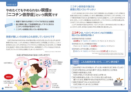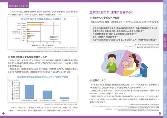 特に今回は、近年、若年層の間で煙が出ないために、害はないとの誤解から主に加熱式たばこ、電子たばこといった新型たばこを使用する方が増えていることを踏まえ、その害を知って頂くため、新たな項目として「禁煙は未来への愛」を設けてページ数を増やし、その内容を充実させた他、全体の見直しを行い、従来の内容についても最新の知見を盛り込んでいます。